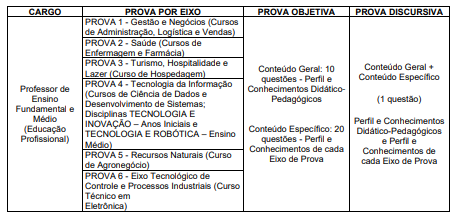 Dentre as 30 questões, 10 questões serão referentes aos Conhecimentos Gerais, Didáticos-Pedagógicos, e 20 questões serão referentes aos Conhecimentos Específicos de cada Eixo de Prova.