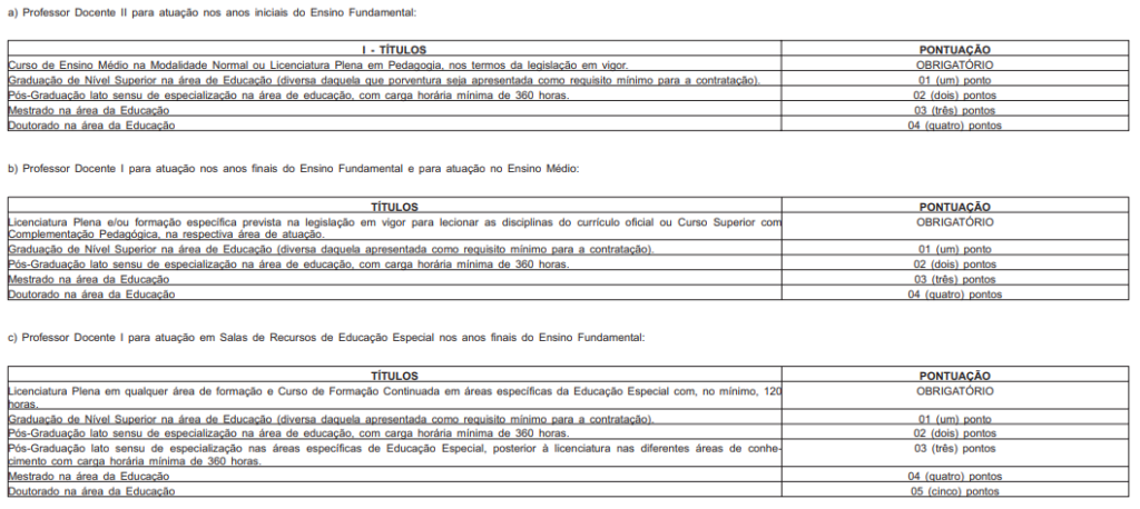 - Curso de Ensino Médio na Modalidade Normal ou Licenciatura Plena em Pedagogia, nos termos da legislação em vigor.