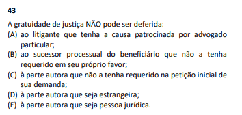 De acordo com a professora, a questão 43 da prova tipo 1 – branca, versa sobre a hipótese em que NÃO pode ser deferida a gratuidade de justiça, apresentando como alternativa correta a letra B, segundo o gabarito oficial. O candidato, por sua vez, assinalou a alternativa C, por entender que esta representa a única hipótese objetiva de indeferimento do benefício caso não haja requerimento na petição inicial.