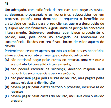 gabarito oficial aponta como correta a alternativa E, que exige o pagamento do preparo pelo advogado.