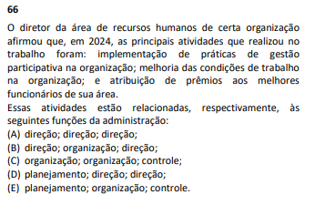 Por fim, a atribuição de prêmios aos funcionários está ligada novamente à Direção, pois diz respeito à motivação e reconhecimento, fundamentais para liderar equipes rumo aos objetivos.