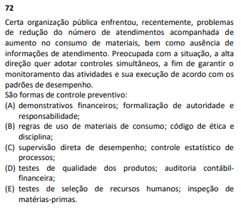 O controle preventivo é aquele realizado antes de os problemas ocorrerem, visando evitar desvios ou falhas. As opções da letra B estão diretamente relacionadas à prevenção, pois atuam antes que os problemas aconteçam.