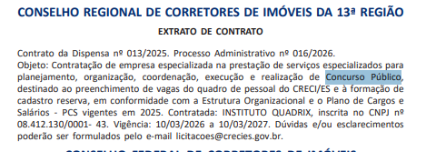 O Concurso CRECI ES já tem banca definida! O Conselho Regional de Corretores de Imóveis da 13ª Região formalizou a contratação do Instituto Quadrix para organizar o próximo processo seletivo, conforme extrato de contrato publicado nesta segunda-feira (16) no Diário Oficial da União.