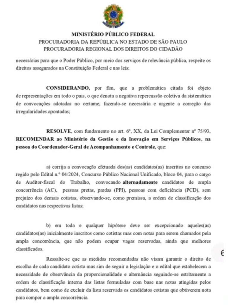 O Ministério Público Federal (MPF), emitiu uma recomendação ao Ministério da Gestão e da Inovação em Serviços Públicos (MGI) para que sejam corrigidas irregularidades na convocação de candidatos com deficiência (PCD), pessoas pretas e pardas (PPI) e da ampla concorrência (AC) no Concurso Público Nacional Unificado (CNU) 2024.