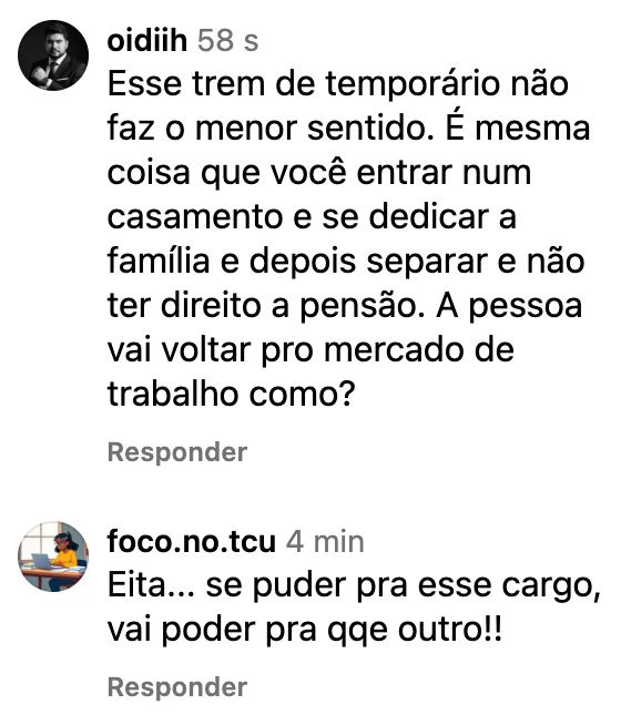 Há quem preveja problemas éticos: “O que vai ter de corrupção…”, insinuando que a modalidade temporária, sem concurso público amplo, facilita indicações políticas. “Tomara que esse moda não pegue”, comentou outra pessoa.