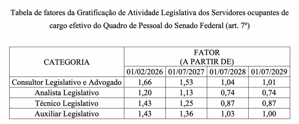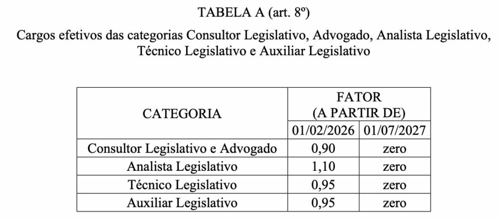 - Gratificação de Atividade Legislativa (GAL): Passará a ser calculada com base no maior padrão do cargo, aplicando fatores novos definidos abaixo: