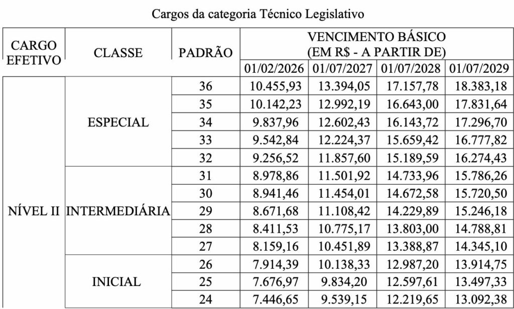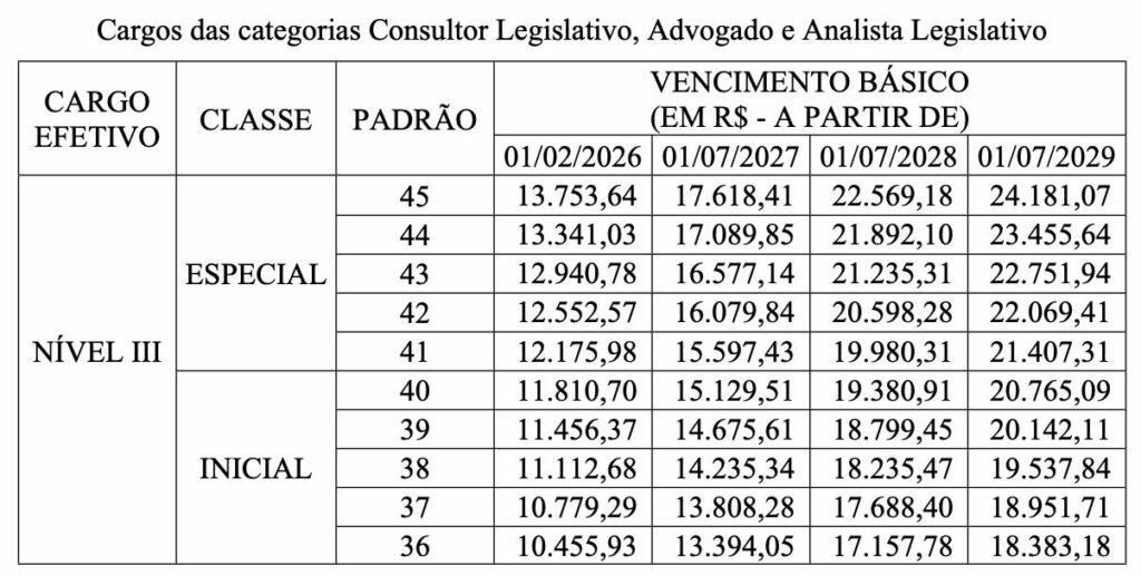 Uma das mudanças mais chamativas é a recomposição parcial dos vencimentos básicos, distribuída em quatro etapas ao longo dos anos de 2026 a 2029.