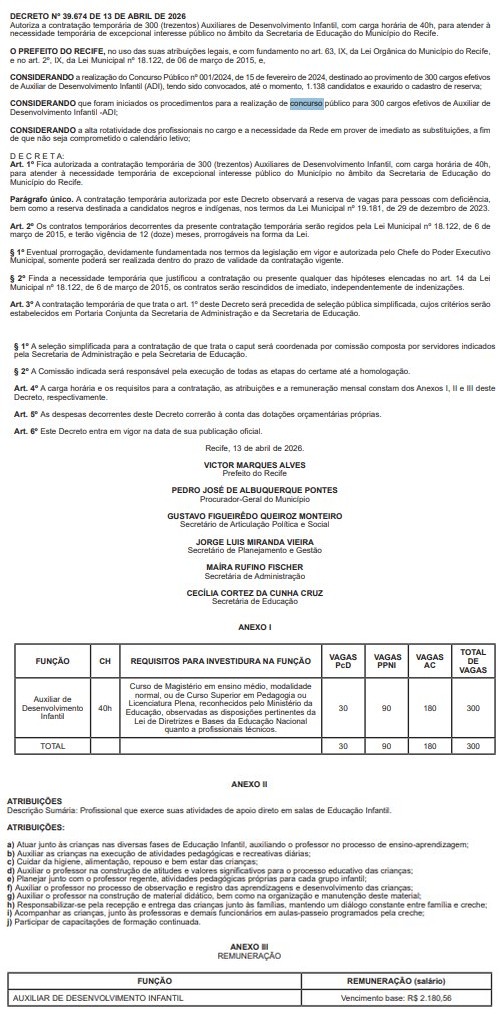 A Prefeitura do Recife publicou do Diário Oficial do município desta terça-feira (14/4) o Decreto nº 39.674, que autoriza a contratação temporária de 300 Auxiliares de Desenvolvimento Infantil (ADI), com carga horária de 40 horas semanais, para atender à necessidade da Secretaria de Educação do município.